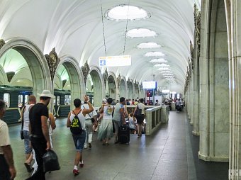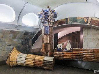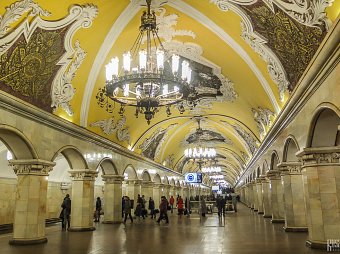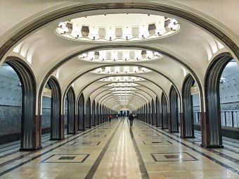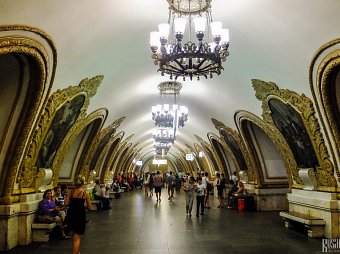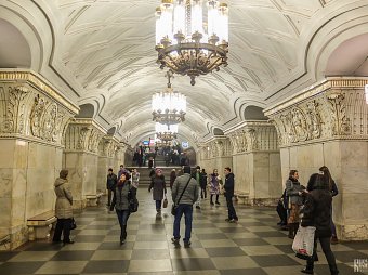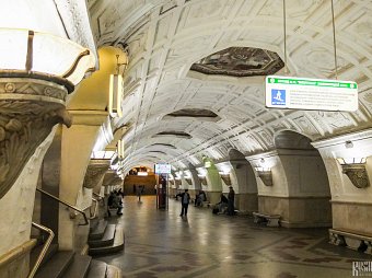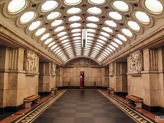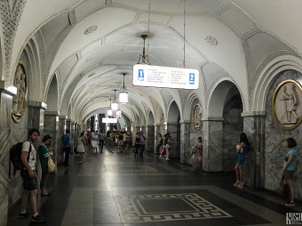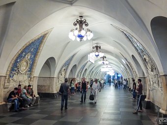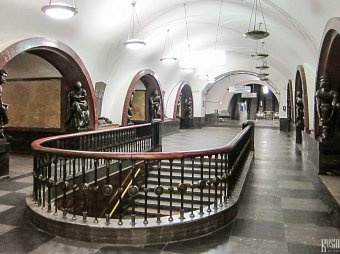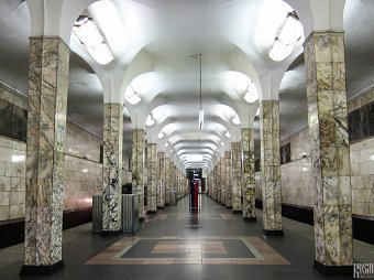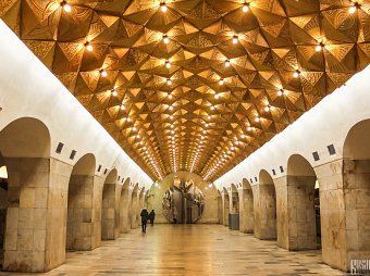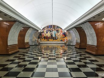 This station is decorated with 32 backlit stained-glass windows lined with steel and gilded brass. At the end of the hall there is a mosaic entitled 'Peace in the Whole World' which depicts a mother holding a child up to the sky. Previously the mosaic included an image of Stalin above the child, but this was later removed. The station's pillars are covered with marble from the Urals. The station was opened in 1952. Read more »