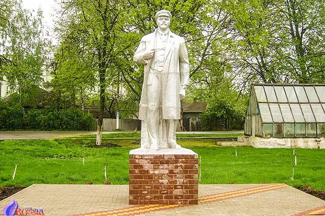 Slightly further up Ulitsa Sovetskaya there is a small roundabout and Ulitsa Sadovaya branches off from Ulitsa Sovetskaya. Situated in the triangle formed by the two streets is the pretty Mikhail Borisov Grammar School which was founded in 1957. Just outside the school is Prokhorovka's Vladimir Lenin Monument which stands on a small brick pedestal. The silver-coloured Lenin is depicted holding the lapel of his raincoat and wearing a flat cap.