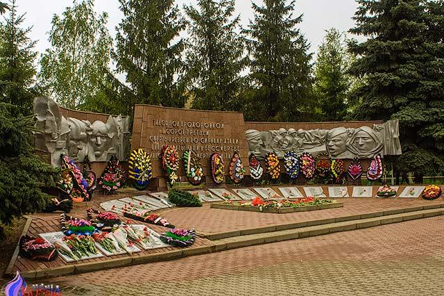 In the small park a little In front of and slightly to the east of Prokhorovka Railway Station is a war memorial and eternal flame. The eternal flame is located in the centre of the complex and behind this is a semi-circular panel. The centre of the panel features the lines "Here outside Prokhorovka in fourty-three, with contempt for death, at the signal of attack our soldiers marched to immortality and the tanks became immortal". To either side of this inscription are reliefs of Soviet soldiers.