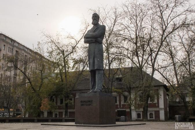 Standing in the centre of Ploschad Prechistenskie Vorota opposite to Kropotkinskaya metro station is a statue of Friedrich Engels - the German philosopher and translator who, along with Karl Marx, is one of the founders of Communism. The monument was unveiled in 1976 and depicts the philosopher deep in thought with his arms crossed standing on a small pedestal. In the 1990s there were calls to have the statue removed, but it was saved on the orders of the then-mayor Yuri Luzhkov.