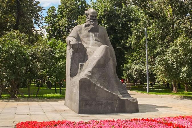 Standing at the front of the small triangular-shaped park of Skver Devichievo Polya (Devichye Pole Gardens) is a statue of Lev Tolstoy. The monument was unveiled in 1972 and depicts the great author carved into large blocks of stone sat down cross-legged. Tolstoy is forever connected with the Khamovniki district of Moscow as he lived nearby in his city estate from 1882 and 1901.