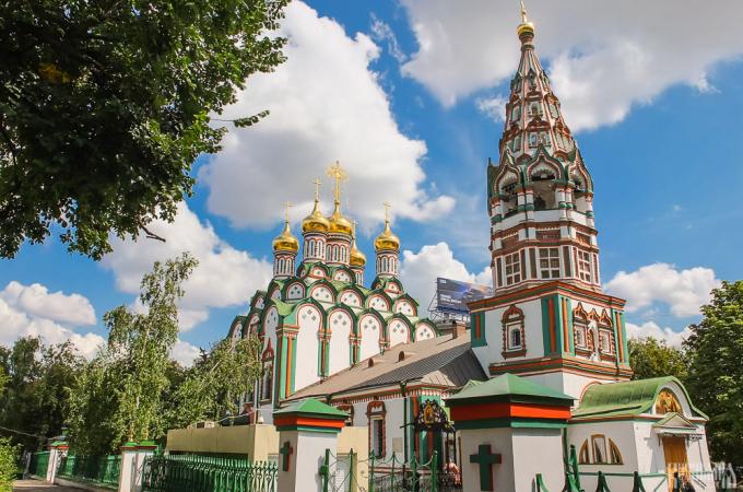 The St Nicholas' Church in Khamovniki was built between 1679 and 1682 although there has been a church at this location since at least 1625. In form the church comprises a standard cube structure attached to a small bell tower via a closed vestibule, but it is its style which makes it stand out. The church is an example of the Uzorochye style with elaborately decorated kokoshniks at the base of the domes and colourful details around the windows and on the bell tower. The church remained open during the whole Soviet period and was kept in a good condition.