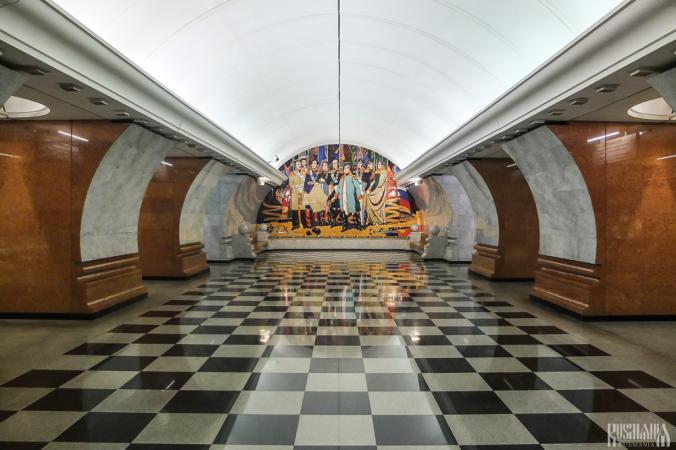 This station is located outside Park Pobedy (Victory Park) and was opened in 2003. It is the deepest metro station in Moscow being 84 metres below ground with a 126 metre long escalator. Currently the station comprises two halls and there are plans to open a new line here at some point in the future. One of the halls is dedicated to the Second World War and features a scene of victory celebrations at one end. The other hall has a scene featuring military heroes of the 1812 War against Napoleon. Both works are by the artist Zurab Tsereteli and made using the technique of enamel on metal.