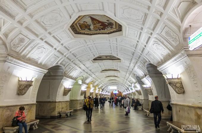 Belorusskaya metro station is named after the Belorussky Railway Station located above. It was opened in 1952. The station is decorated with Belarusian motifs adorning its ceiling, light fixtures and marble pylons. The 12 mosaics on the ceiling also depict scenes of Belarusian life. In the transfer between the two Belorusskaya metro stations is a statue called 'Belarusian Partisans' featuring an old man, a woman and a young boy.