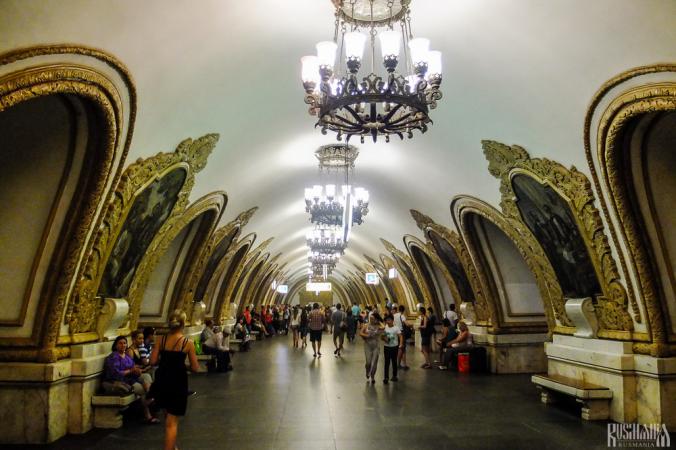 The station originally contained the highest concentration of Stalin portraits - five in total. At the end of the station there was a large mosaic of Stalin and Lenin but this has since been replaced with a small portrait of Lenin. The station was opened in 1954.