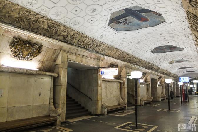 The main theme of the decorations of Novokuznetskaya metro station is the struggle and resilience of the Soviet people during the Second World War and the station was opened in 1943. The station's pillars and arches are finished in marble and decorated with high reliefs depicting military scenes. The station also has benches made out of white siberian marble. The ceiling is decorated with six mosaics dedicated to the heroic achievements of wartime industry: gardeners, steel founders, car builders, builders of skyscrapers, pilots and skiers. The mosaics were put together by Vladimir Frolov, using the designs of Aleksandr Deyneka, from his workshop in Leningrad during the blockade of the city. They were then transported at great risk to Moscow along the Road of Life across the frozen Lake Ladoga. Frolov however shortly afterwards died of starvation during the blockade. At the end of the station there is a panel entitled 'The Frontline and the Home Front Fighting against the German Invaders'.