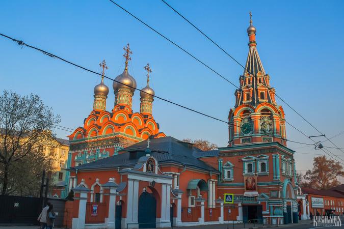 Further down Ulitsa Bolshaya Polyana is one of the most colourful churches in Moscow - St Gregory of Neocaesarea's Church at Derbitsy. The current stone version of the church was built between 1668 and 1679 and is an example of the decorative Russian barque style known as Uzorochye. The church has five grey domes which stand on turquoise tholobates whose bases are decorated with orange and green kokoshniks. The attached tent-dome bell tower is painted in the same colours. In 1938 the church was closed but was eventually returned to the Orthodox Church in 1990.