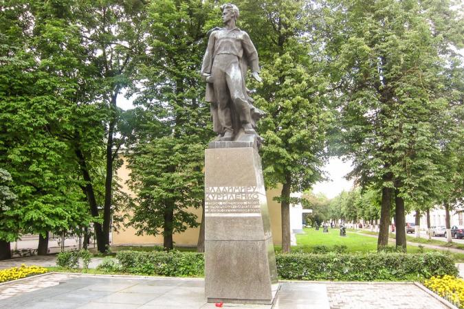 This monument is dedicated to Vladimir Kurilenko who was a member of a partisan-sabotage squad active in the occupied Smolensk Region during the Second World War. Kurilenko had great success in harassing the occupiers by blowing up bridges and equipment and killing enemy soldiers. He was eventually wounded in May 1942 and died of his injuries aged just 17. After his death he was awarded the title of Hero of the Soviet Union for his bravery and for the example he set for carrying out military actions in occupied territory.